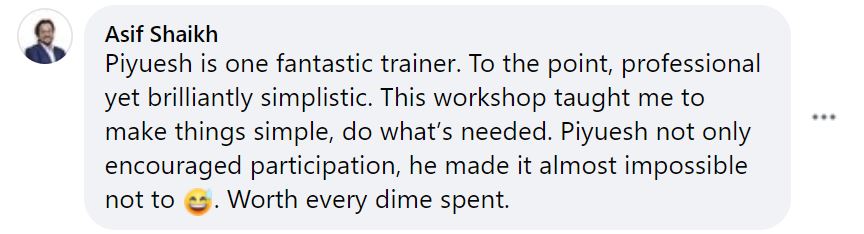 He has trained more than 37000+ professionals globally from companies like BCG, Deloitte, Salesforcee, Adobe, Hewlett Packard, Hero Motor Corp, Amdocs, Infosys, TATA, Fiesland Campina, Cargill and 65 more.